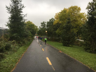 Pour ma part, j'ai fait mes 5 X 1 km rapide autour du pace demi-marathon (5:45, 5:38, 5:37, 5:26 et 5:39). J'ai du composer avec les courbatures laissées par la sortie de la veille. Ici, voici certains de mes amis sur la piste cyclable de la rivière Saint-Charles lors d'un kilomètre lent: