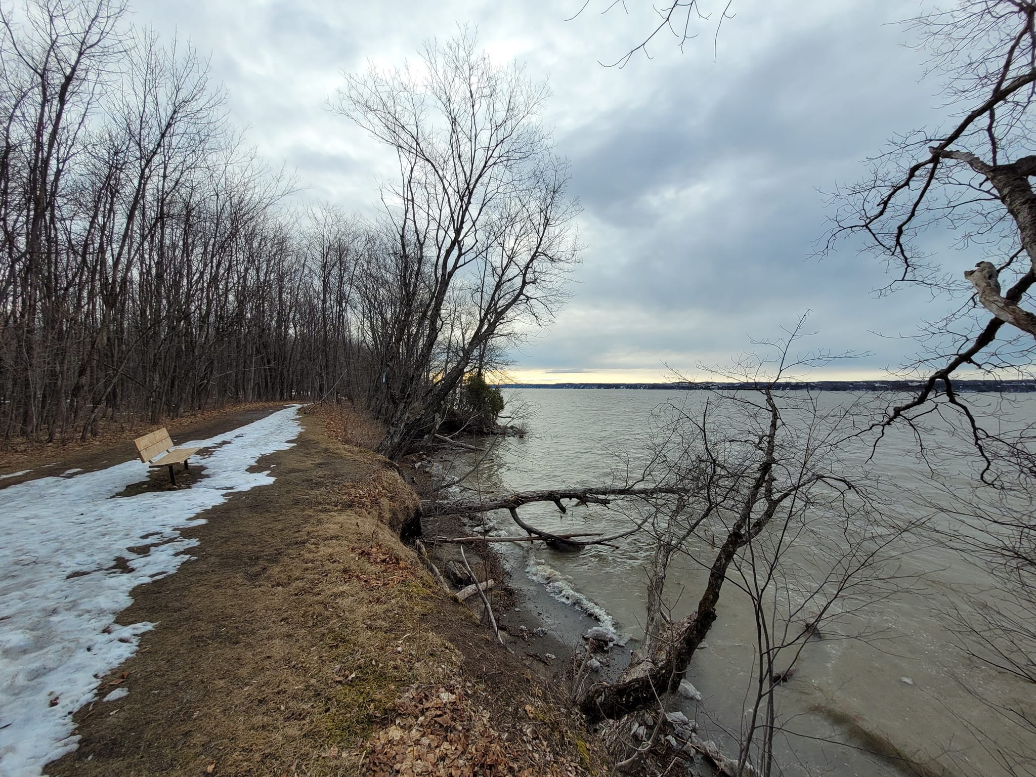 Dimanche 10 avril: 1 C. Belle petite sortie en sentier dans le Parc linéaire de la rivière Saint-Charles, secteur Chauveau sud, sur de la neige granuleuse: marche-course 1 min. 1min.. Au total pour cette sortie, 5.02km en 56:49, soit une allure moyenne de 11:19 km.